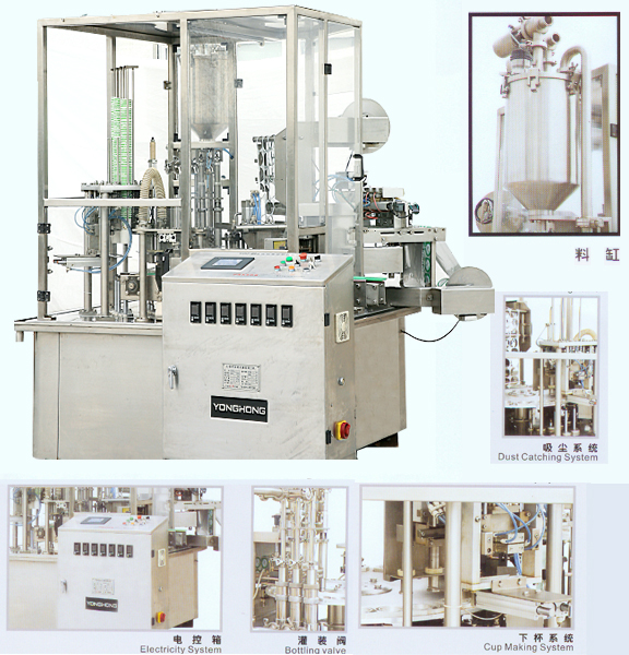 The Filling Sealing Machine specially designed for paper cup and plastic cup, integrates cup lowering, filling , cap making and sealing. It could bottle sirup, imported electrical elements and has a man-machine interface control has the character of few holding area and higher automation.